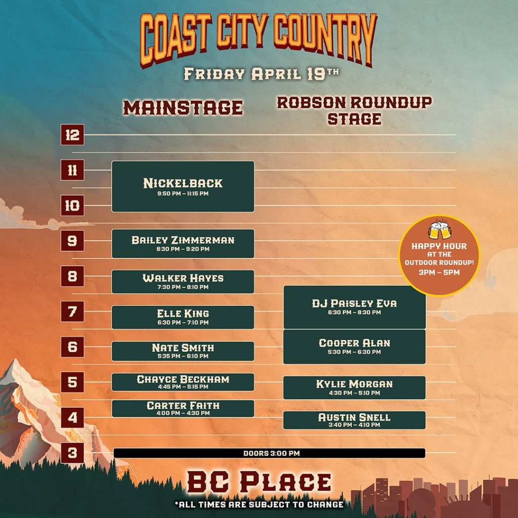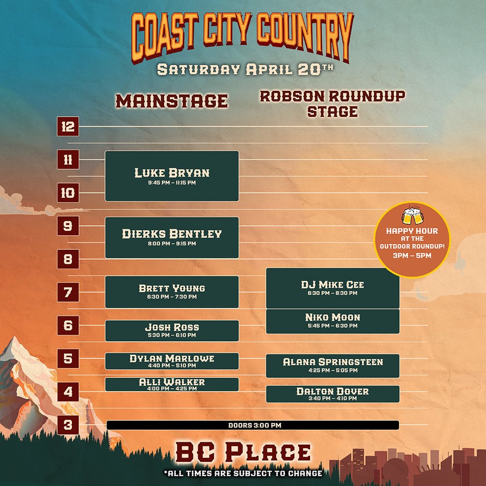 Saddle up and get ready to don your cowboy boots! Presented by Live Nation, the Coast City Country Festival has announced their star-studded lineup and the set times for its inaugural event on April 19-20, 2024 at BC Place in Vancouver, BC.