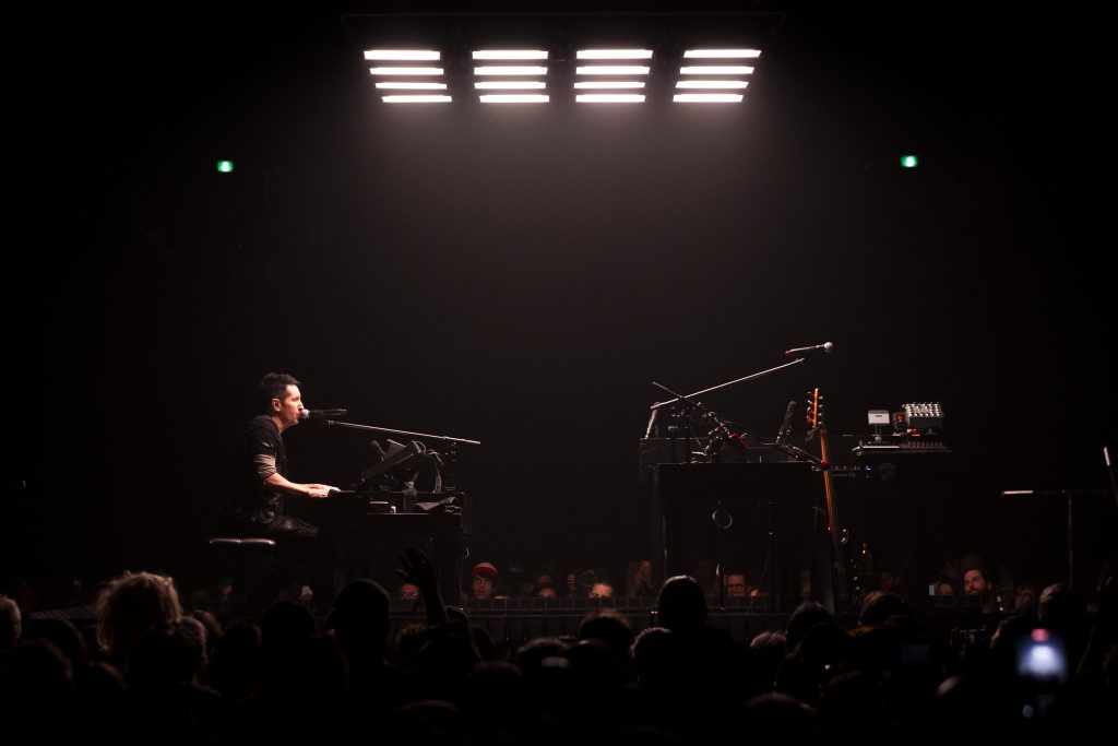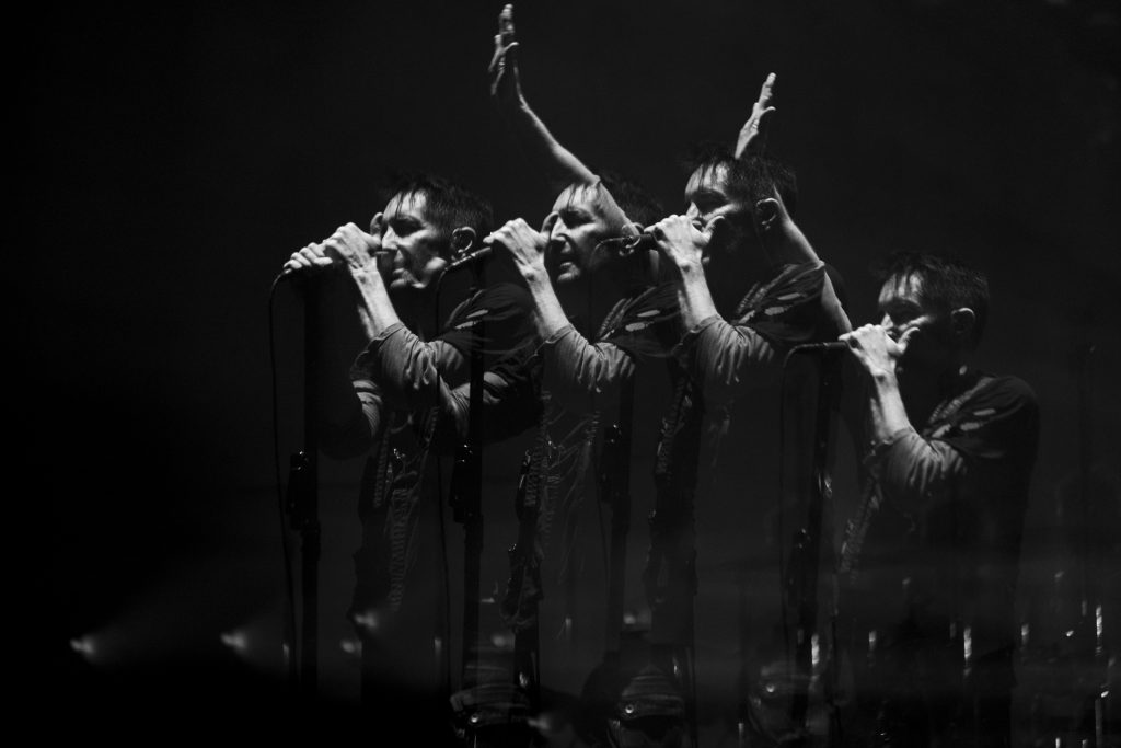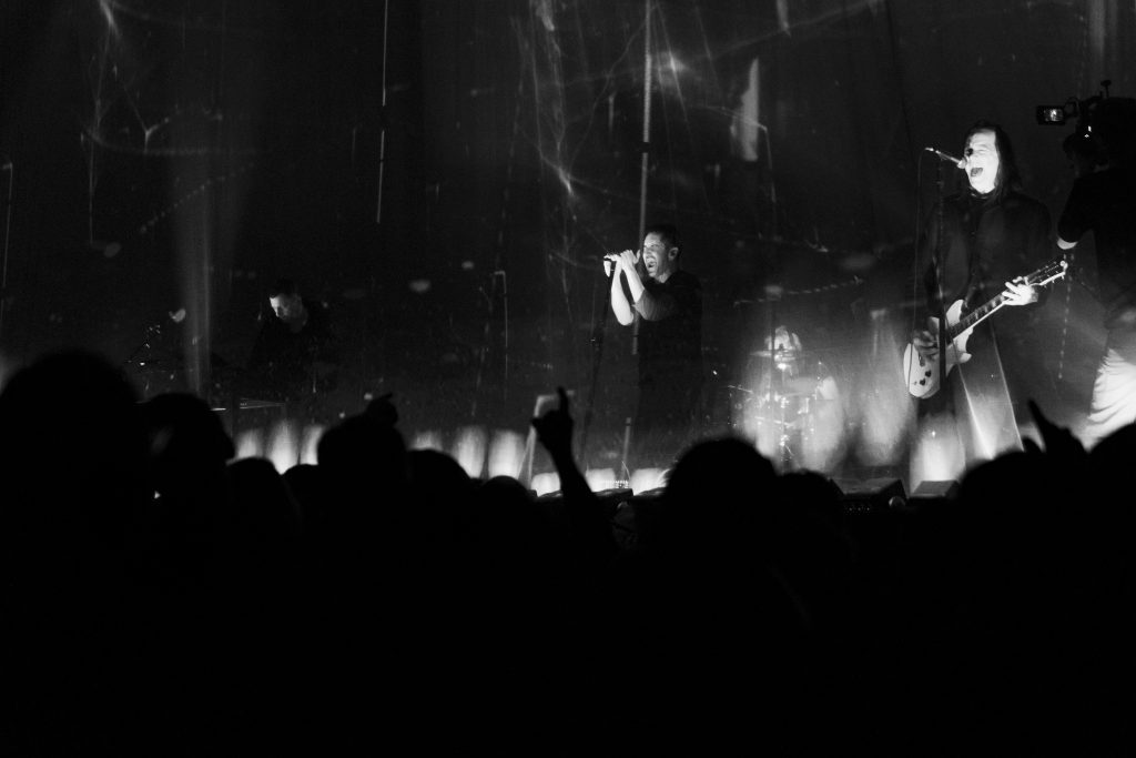 “Copy of A” delivered one of the night’s most striking visuals: multiple projected versions of Reznor layered across the curtain, fragmented and multiplied, perfectly mirroring the song’s themes of identity and replication. It was chaotic and mesmerizing.
